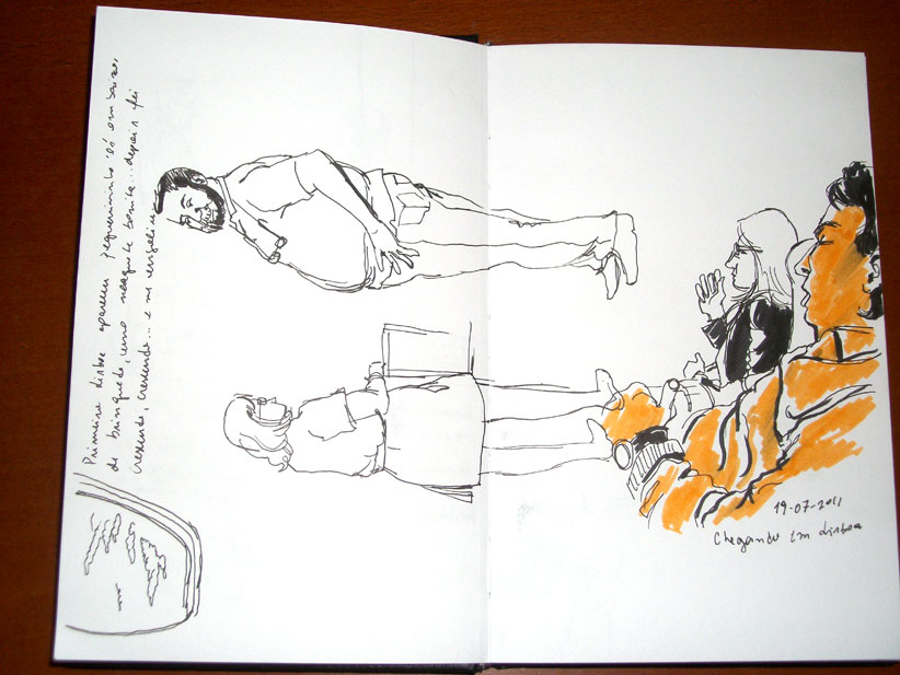 Pela janela do avião, Lisboa apareceu pequena pra mim, parecia de brinquedo, lá do alto, uma maquete bonita, perfeita... O avião começou a descer, ela cresceu, foi crescendo mais e mais e de repente me engoliu. Que cidade bonita, exuberante de ponta a ponta, fiquei maravilhado. Não sabia nem por onde começar... queria ver a estátua de Fernando Pessoa e de tão perdido nem percebi que ela estava a uns dez metros do hotel, debaixo do meu nariz. Bem, logo de cara já conheci o Eduardo Salavisa, um desenhista ótimo e grande incentivador da arte de rabiscar em cadernos, além de grande pessoa; Foi através do site , que ele mantém até hoje, que eu tomei contato, lá atrás, em 2006, com outros artistas que mantinham diários, onde registravam com traços e cores seus cotidianos, e percebi que não estava sozinho no mundo. Lembro que pensei: "Existem outros artistas no mundo que desenham obsessivamente, o tempo todo, no seu dia a dia! Que legal". Na época enviei um email para o Salavisa perguntando se poderia expor meus desenhos no site "Diário Gráfico" e para minha surpresa ele respondeu, depois de ver os meus trabalhos, que sim. Não imagina a felicidade que isso me proporcionou na época. Os desenhos eram de 2005 e estão no site até hoje. Desde então muita coisa aconteceu e lá se vão quase cinco anos. Daquele tempo pra cá aumentou muito a quantidade de pessoas que desenham nas ruas. É incrível, um fenômeno mundial, basta ver a quantidade de pessoas que os sketchcrawl têm reunido. Os adeptos de diários gráficos quadruplicaram e estão rabiscando por todos os cantos do mundo, isso é um fato. Continuando, depois fui com o Eduardo até a Faculdade de Belas Artes de Lisboa conhecer o local onde vai ser dada a largada para o “Symposium urban sketchers Lisboa”. A exposição está muito bonita. Depois saí para andar mais pela cidade e desenhar um pouco, afinal, também é para isso que estou aqui.